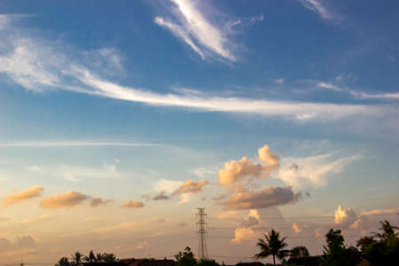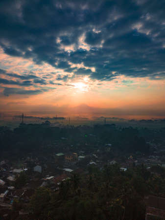 Rural landscape of sunrise with mountains. The sky look dramatic with reddish orange in cloudy weather. Seen Village, rice field and dense of trees covered by mist. Indonesia