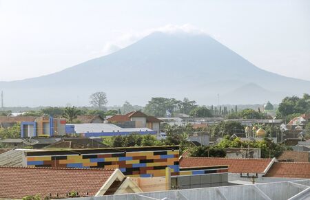 Aerial view of sunset Mount Merapi and Yogyakarta city, Indonesia. City with mountain background view.