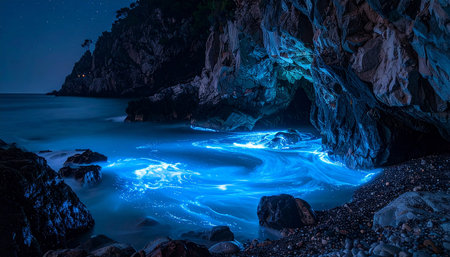 A nighttime scene of a sea cave with swirling blue bioluminescent water creating a magical glow against dark rocks.