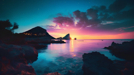 The tranquil waters wash over rugged rocks along the shoreline, reflecting soft twilight hues and creating a peaceful coastal ambiance.