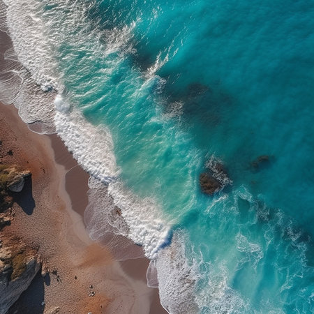 An overhead view showcasing a beach and a body of water, providing a comprehensive look at the coastal landscape, Immersive aerial view of a wild seafront with scattered rocks, AI Generated