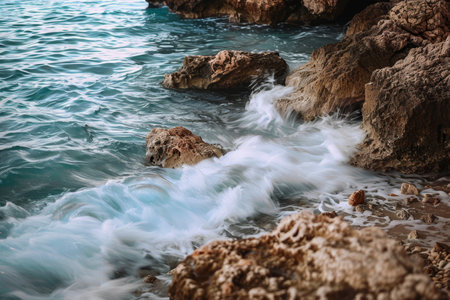 Powerful ocean waves crash dramatically against rugged rocks, creating a breathtaking scene perfect for adventure tourism and surf schools.