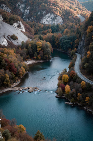 Beautiful autumn landscape with river and forest in Caucasus mountains, Georgia