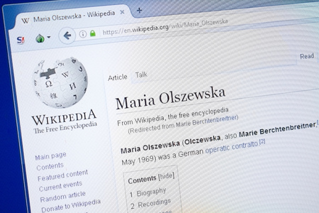 Ryazan, Russia - August 19, 2018: Wikipedia page about Maria Olszewska on the display of PC