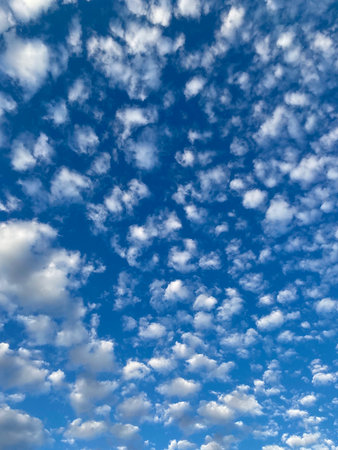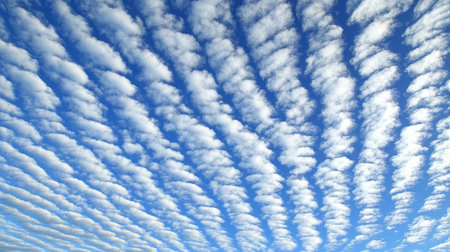 Skyward Perspective Orderly Rows of Cumulus Clouds Stretching Across a Vibrant Blue Expanse