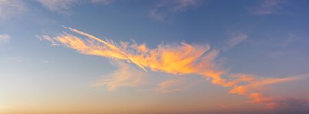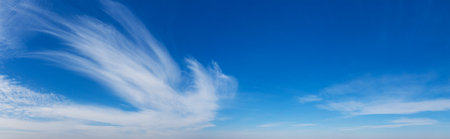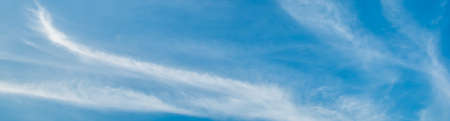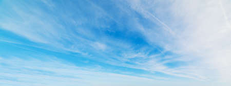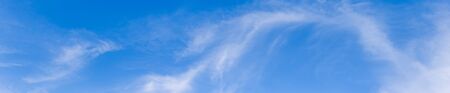 Light cirrus clouds in the blue sky panorama. Cirrus clouds variety on a sunny day. Wide shot of beautiful calm skyscape. Background for weather and climate concept. Outdoors.