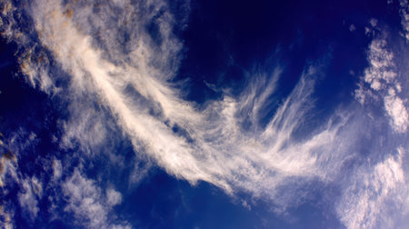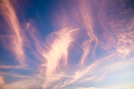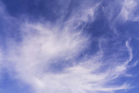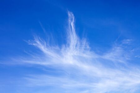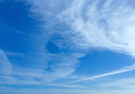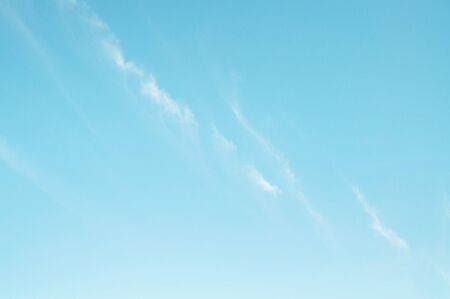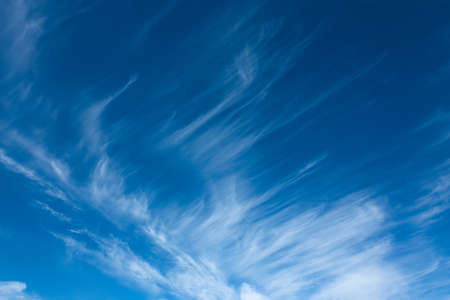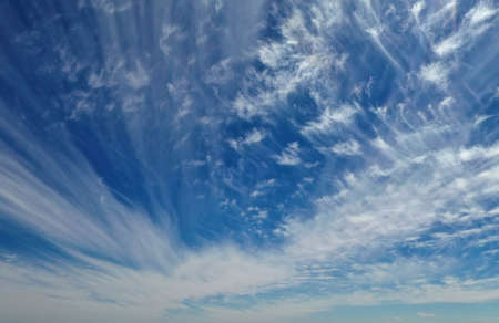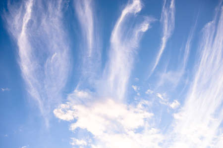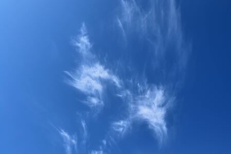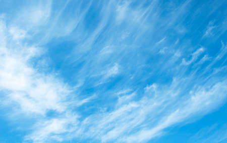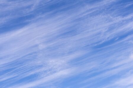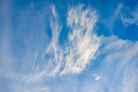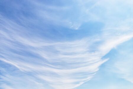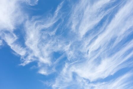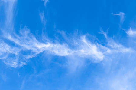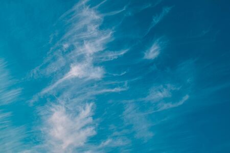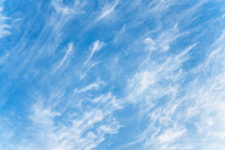 Blue sky and white cirrus clouds background. Amazing spindrift clouds. Natural backdrop.