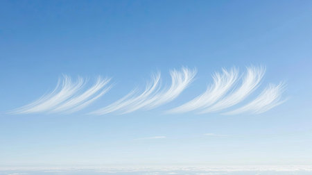 A stunning formation of wispy clouds stretches across a clear blue sky, creating a serene atmosphere over an expansive landscape. Perfect for nature themes.