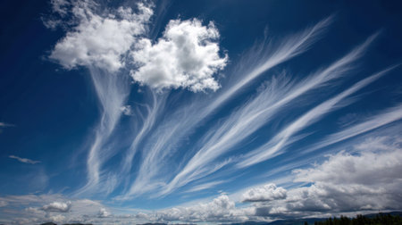 A stunning display of cirrus clouds, resembling brushstrokes, against a deep blue sky, with cumulus clouds adding contrast.
