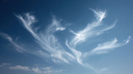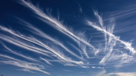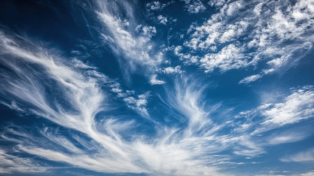 Beautiful wispy cirrus clouds form intricate patterns against a clear, bright blue sky, creating a sense of depth and movement.