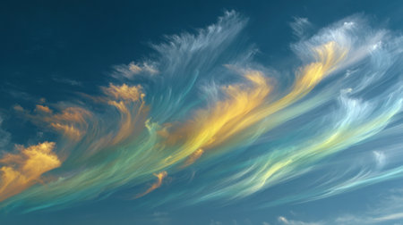 Delicate, feathery cirrus clouds streak across a vibrant blue sky, displaying subtle iridescent colors.
