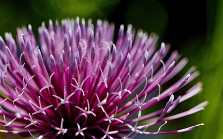 Bright purple flowers with thorns on a green blurry background, close-up shot.