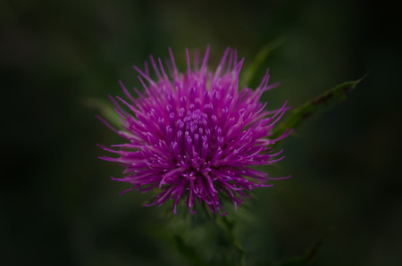 beautiful purple thistle flower blooms in the meadow, narrow focus area, contour light
