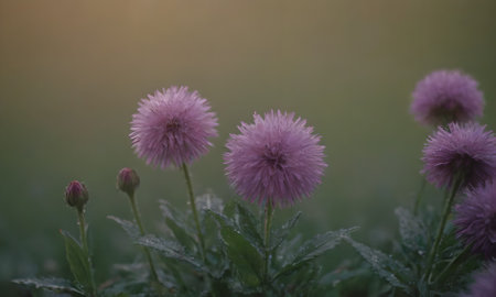 Purple thistle flower head blooming in a field during sunrise, showcasing its delicate beauty and prickly nature in the soft morning light with other thistle flowers blurred in the background