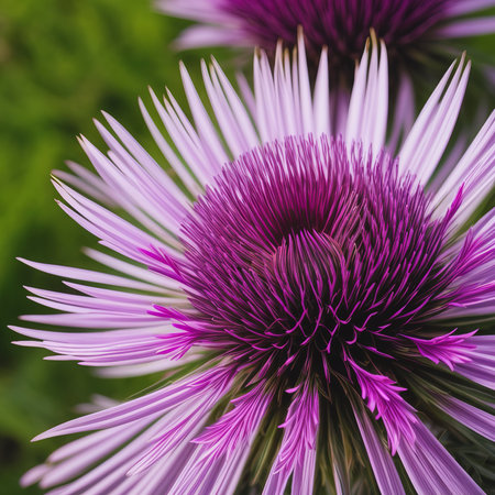 Close-up captures vibrant purple thistle flowers, showcasing their intricate details against a soft, blurred background, perfect for spring or botanical themes.