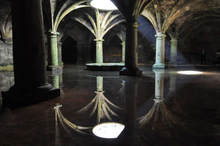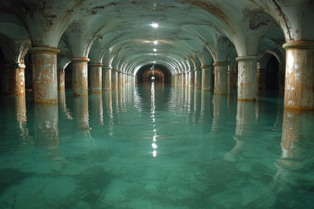Ancient underground cistern architecture with mysterious green lighting and reflections.