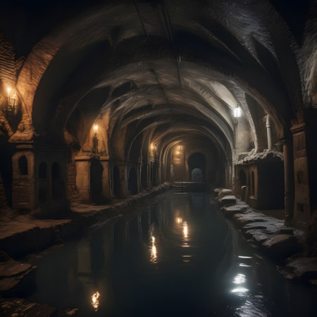 A serene view of an underground tunnel featuring dramatic arches, still water, and soft lighting, creating an eerie yet captivating atmosphere perfect for exploration themes.