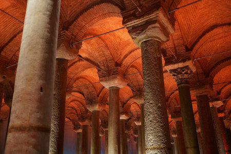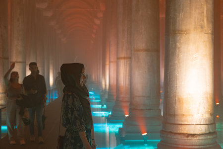 Ancient byzantine underground basilica cistern with illuminated arches and columns. August 12, 2025 Istanbul Turkey.
