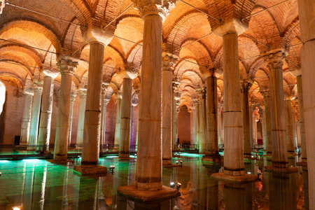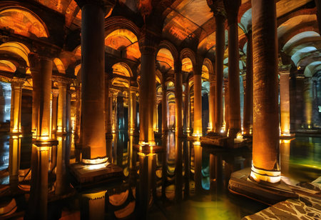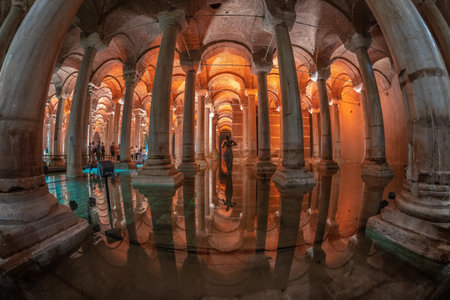Majestic basilica cistern with illuminated columns and reflective waters in istanbul. August 12, 2025 Istanbul Turkey.