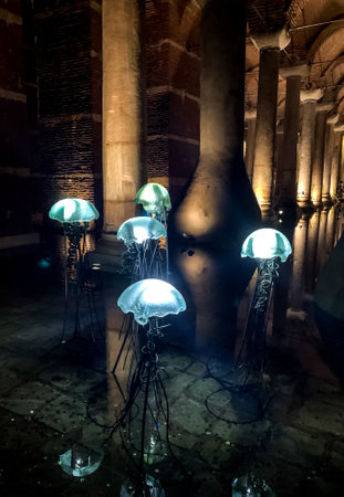 Basilica Cistern Ancient Columns and Modern Jellyfish in Istanbul, Turkey.