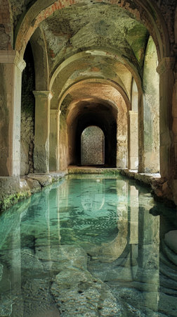 Ancient roman bathhouse with clear water and arched ceiling, reflective surface. Historical architecture and tranquility concept.