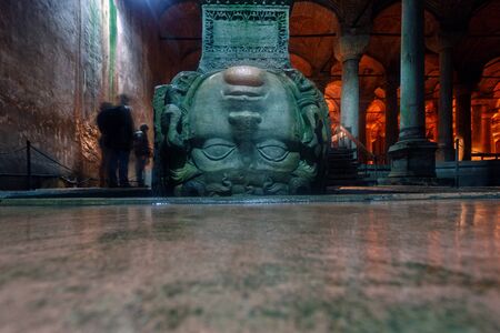 ISTANBUL, TURKEY - JULY 28, 2016: Medusa columns base inside Basilica Cistern. The Basilica Cistern is the largest of several hundred ancient cisterns that lie beneath the city of Istanbul.