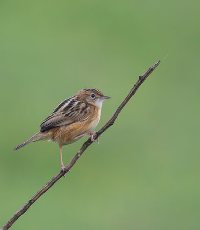 Striated Grassbird (Megalurus palustris) beautiful stripe brown bird with long tail perching on top of the branch over green background, exotic creature