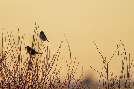 Closeup of a Whinchat bird, Saxicola rubetra, foraging in vegetation