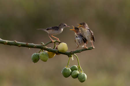 Small warbler bird Zitting cisticola or Cisticola juncidis perched on a branch