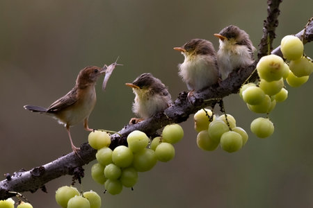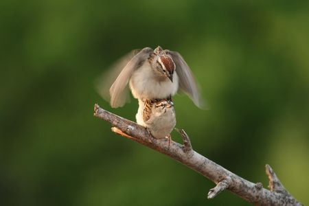 natural background with little funny birds sparrows and Chicks sitting on a branch in a warm summer garden