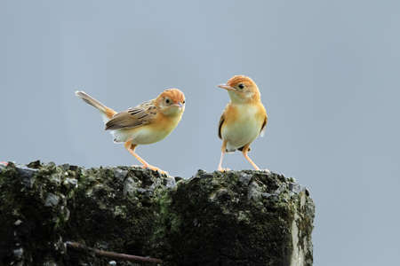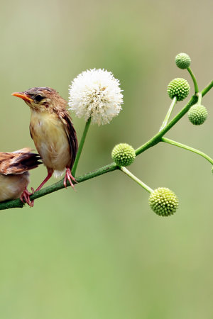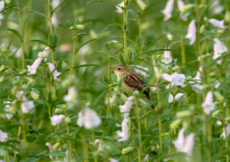 The small cute bird of zitting cisticola or streaked fantail warbler (Cisticola juncidis) on nature background