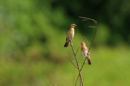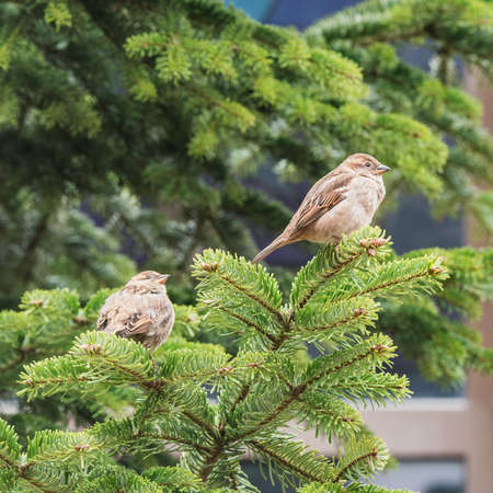 panoramic portrait of small funny birds sparrows restlessly sitting on a tree branch in a Sunny green garden