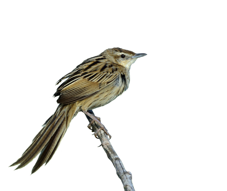 Striated Grassbird (Megalurus palustris) beautiful stripe brown bird with long tail perching on stick in paddy field isolated on white background, exotic creature
