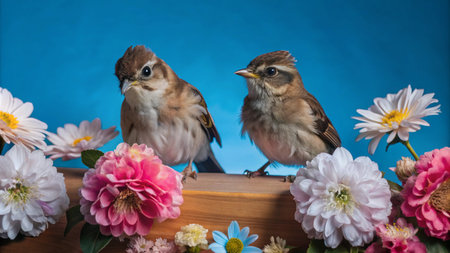 Two small brown birds perched on a wooden surface surrounded by white and pink flowers against a blue background.