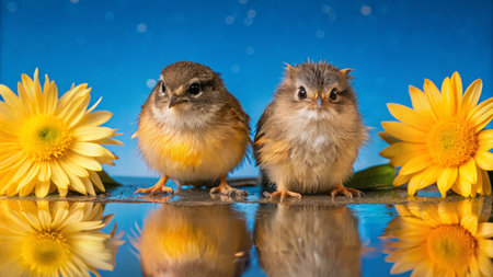 Two adorable baby birds perched on a reflective surface with yellow flowers against a blue background.