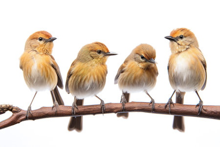 Image of group of buff-breasted babbler birds on a branch on a white background. Birds. Animals. Illustration, Generative AI.