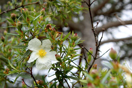 Flowering of Cistus salviifolius on Mount Carmel in February in Israel. Flora of Israel