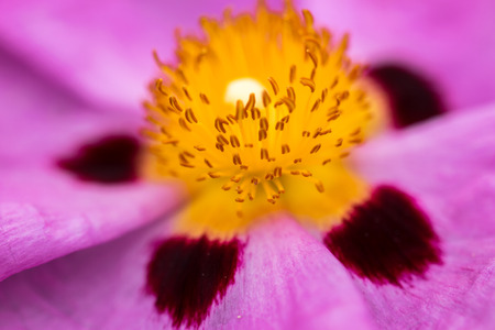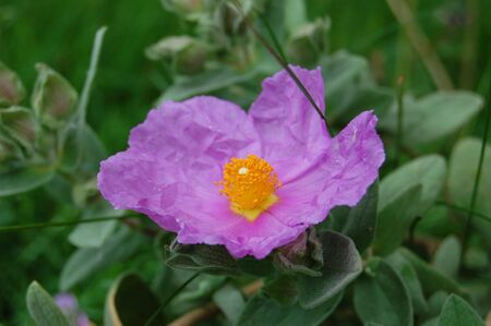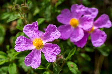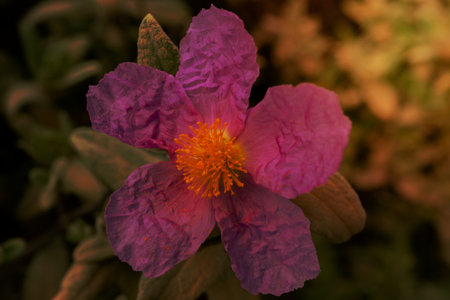 Cistus albidus gray-leaved shrub plant with purple pink flowers and orange-yellow center typical of limestone soils flash lighting