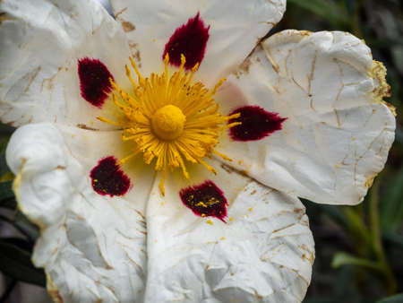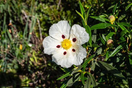 Cistus Ladanifer a summer flowering shrub plant with a white and red summertime flower commonly known as Common Gum Cistus, stock photo image