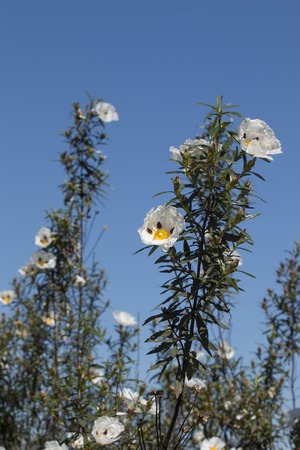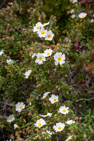 Cistus ladanifer, Rockrose flowers or Labdanum at the Archaeological Circuit in Vale Fuzeiros at Vilarinha, Algarve, Portugal. Wild flowering plants in the family Cistaceae.