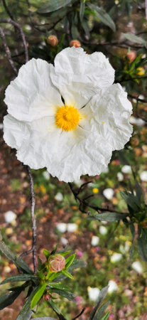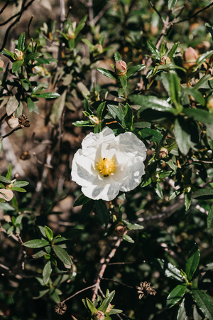 Close up of white labdanum. Green leaves. Outdoor. Vertical shot