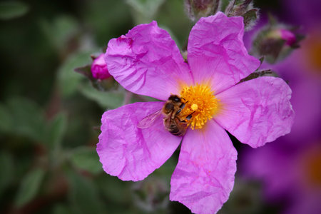 Cistus creticus 'Rock Rose' pink flowers. Cistus incanus. Evergreen Mediterranean native blossoming plant in spring summer garden. Wild nature flower with yellow stamens surrounded by crepey petals.