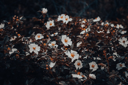 Wild rosehip blossom flower with raindrops concept photo. Growing plants in garden.