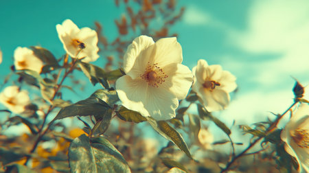 A photo of white wild roses in full bloom, with blurred background and sunlight creating a soft blue sky. The flowers have large petals that are bright yellowish-white, and the leaves on their branches are green. There is also one small bee perched on an open rose petal. This scene gives off warm spring air and peaceful nature vibes. --chaos 30 --ar 16:9 --v 6.1 Job ID: 01203a13-276d-4500-992d-e8c79cf79bd5