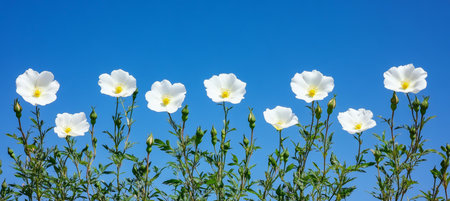 Seven Pristine White Wild Roses, Fresh Foliage, Unopened Buds, Vibrant Blue Sky, Natural Light