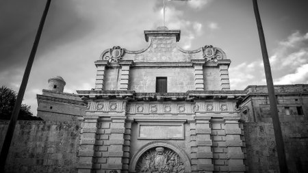 Famous Mdina Gate at the historic hilltop city of Mdina - MALTA, MALTA - MARCH 5, 2020