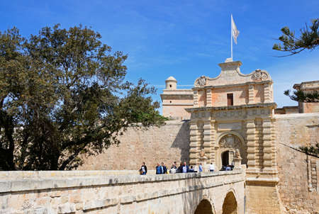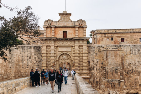 Mdina, Malta - April 14, 2024: Tourists walk across the stone bridge leading to the Main Gate of Mdina, a Baroque-style entrance to the ancient walled city, featuring detailed stone carvings
