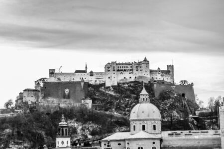Top view on Salzburg city and Hohensalzburg fortress at winter, Salzburg Austria. Black-and-white photo
