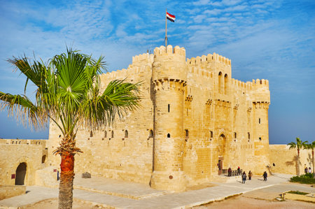ALEXANDRIA, EGYPT - DECEMBER 17, 2017: The view of Qaitbay citadel behind the palm tree of its small garden, on December 17 in Alexandria.