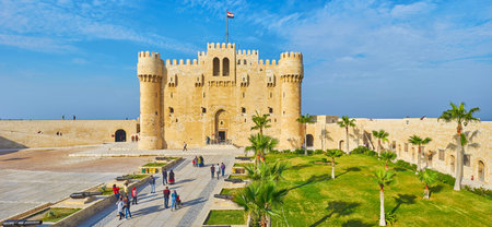 ALEXANDRIA, EGYPT - DECEMBER 17, 2017: Panorama of Qaitbay citadel's courtyard with garden, castle and parade ground, surrounded by massive walls, on December 17 in Alexandria.